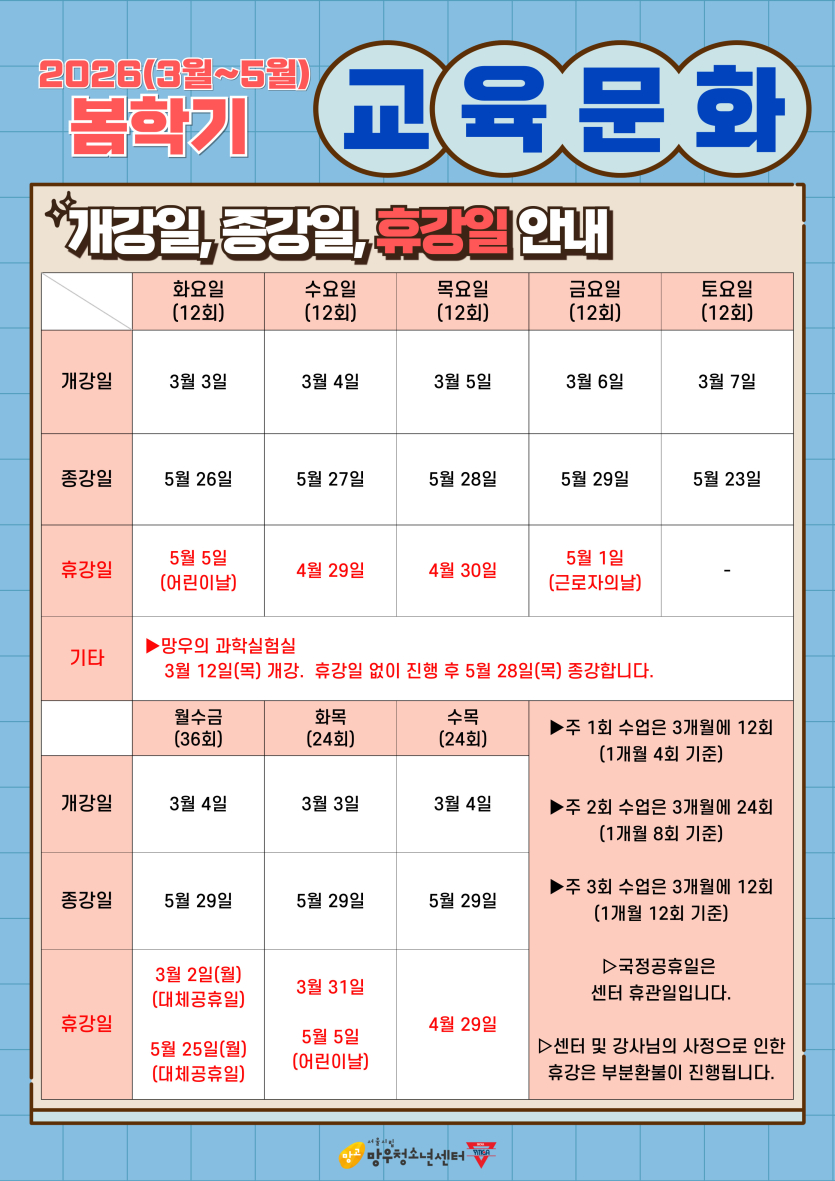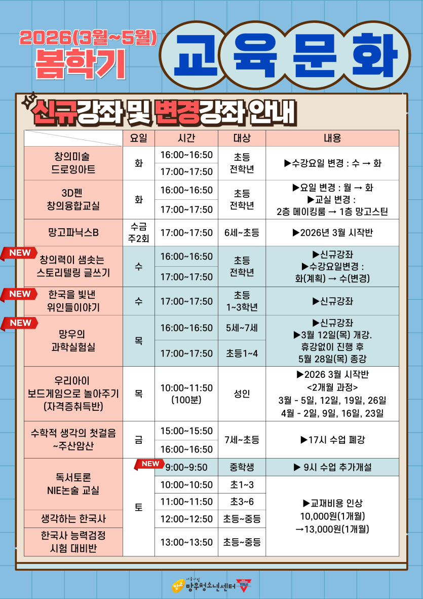 목록 [체육·문화] [교육문화]봄학기 안내사항(신규강좌, 변경내용) 페이지 정보 작성자 시립망우청소년센터 댓글 0건 조회 5회 작성일 2026-01-16 본문 . 추천0 이전글2026년 2월 수영 기초반 접수안내 26.01.16 다음글시립망우청소년센터 생활체육팀 신규 프로그램 개설 (아쿠아워킹)강사 채용 공고 26.01.14 댓글 0 댓글목록 등록된 댓글이 없습니다. 목록