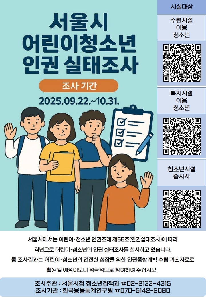 목록 [공지] 「2025년 서울시 어린이·청소년 인권실태조사」 설문조사 페이지 정보 작성자 시립망우청소년센터 댓글 0건 조회 545회 작성일 2025-09-26 본문 감사합니다. 추천0 이전글시립망우청소년센터 2025년 9월 수의계약 정보 공개 25.09.27 다음글2025년 10월 수영 기초반 접수안내 25.09.20 댓글 0 댓글목록 등록된 댓글이 없습니다. 목록