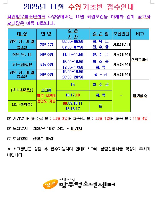 목록 [모집] 2024년 11월 수영 기초반 접수안내 페이지 정보 작성자 시립망우청소년센터 댓글 0건 조회 525회 작성일 2025-10-17 본문 감사합니다. 추천0 이전글[교육문화]원어민강좌 교재안내(12월) 25.11.05 다음글(긴급)서울시립망우청소년센터 방과후아카데미 실내체육(음악줄넘기) 강사 채용 공고 25.10.15 댓글 0 댓글목록 등록된 댓글이 없습니다. 목록
