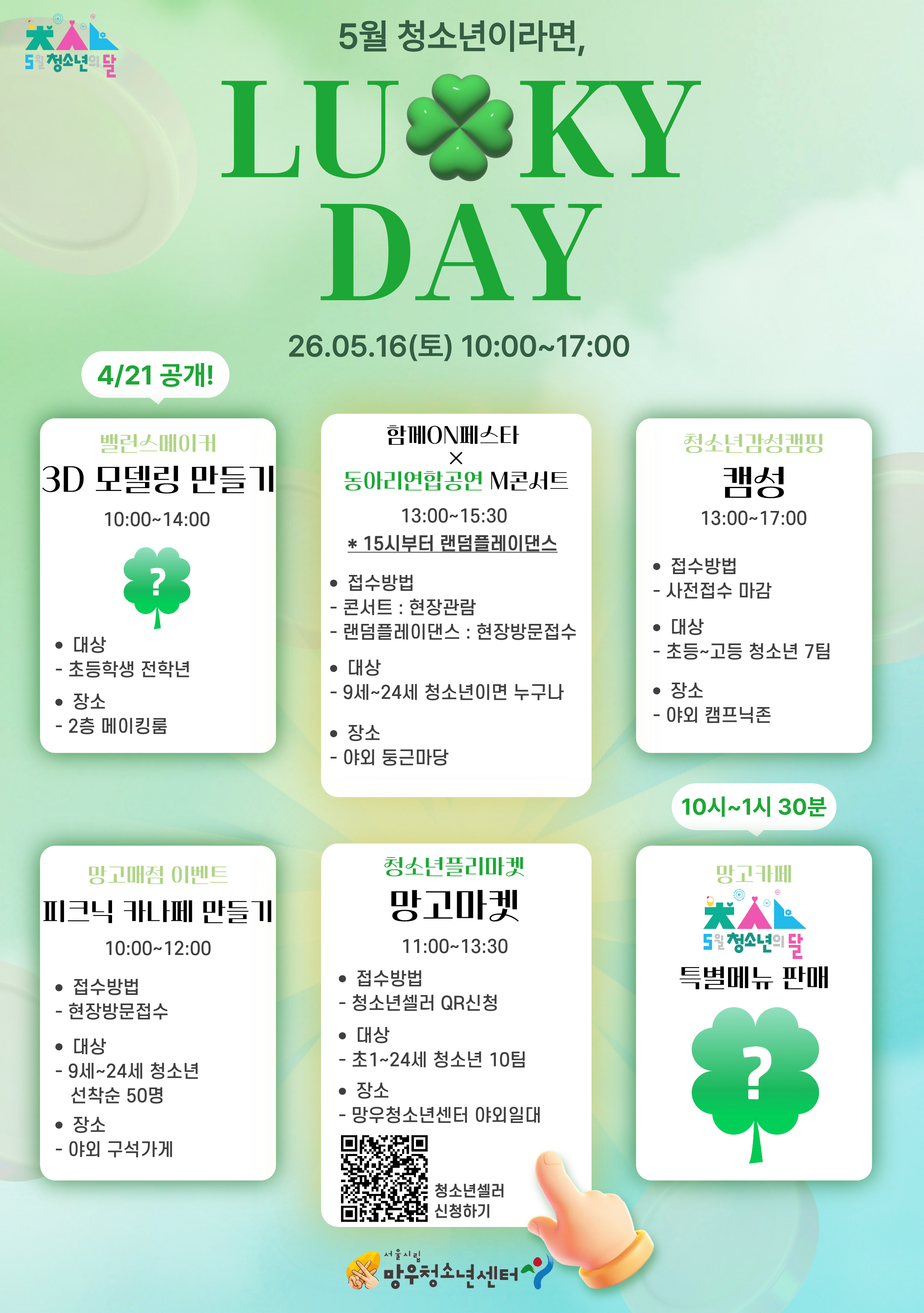망우청소년센터에서 다양한 프로그램 안내 및 신청정보입니다.- 채용[채용] 서울시립망우청소년센터 생활체육팀(토요일 오후 )수영강사 채용 공고26.04.09