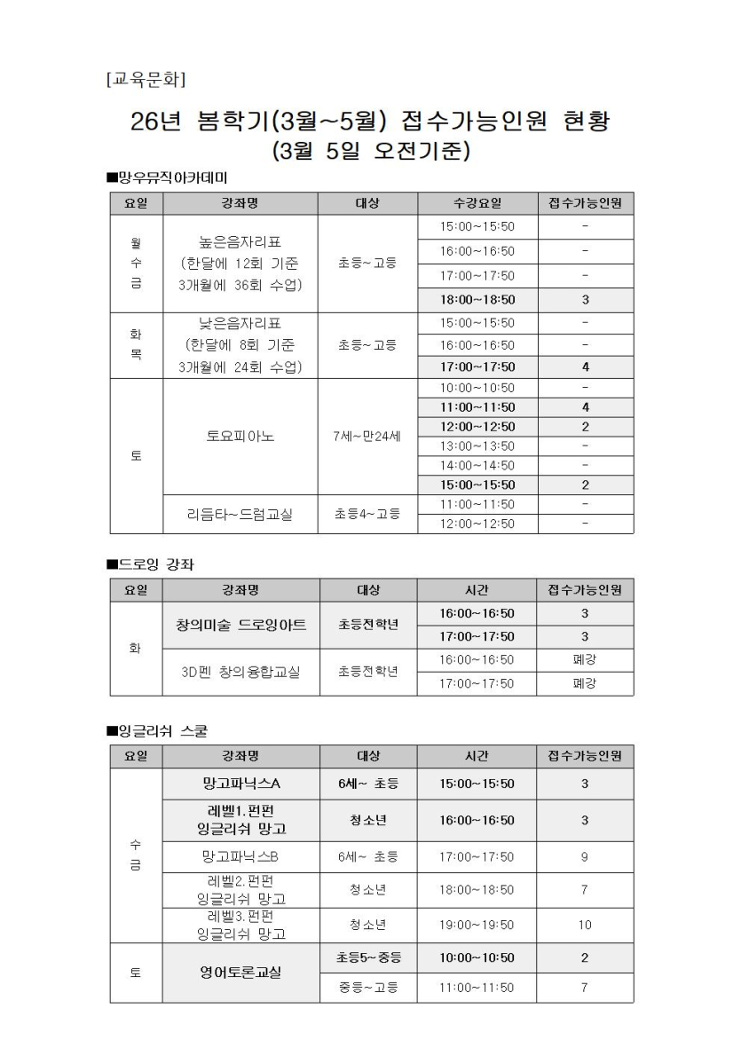 [체육·문화] [교육문화]봄학기(3월~5월) 접수현황 수정(3월 5일 오전 기준)