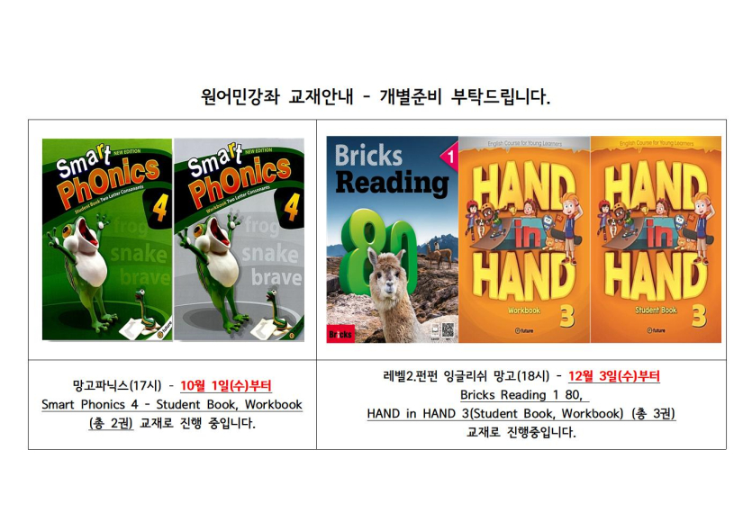 목록 [체육·문화] [교육문화]원어민강좌 교재안내(2월) 페이지 정보 작성자 시립망우청소년센터 댓글 0건 조회 7회 작성일 2026-02-03 본문 . 추천0 다음글[긴급] 서울시립망우청소년센터 생활체육팀 헬스 파트타임 강사 채용 공고 26.01.30 댓글 0 댓글목록 등록된 댓글이 없습니다. 목록