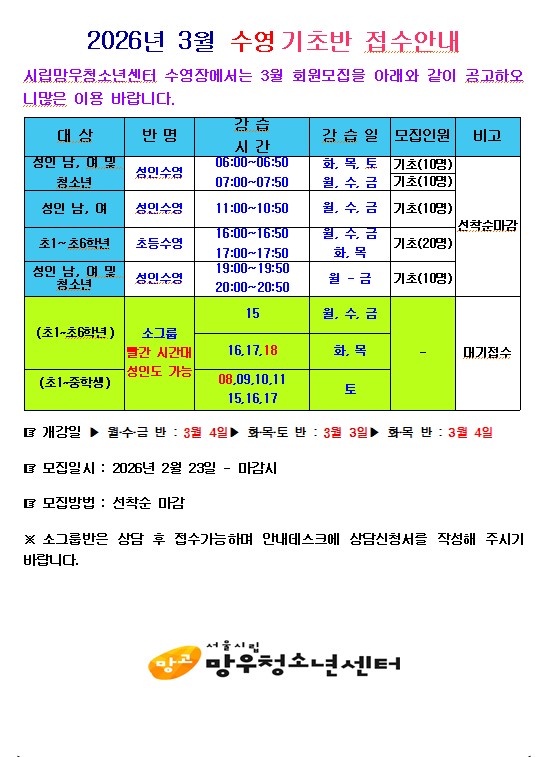 목록 [모집] 2026년 3월 수영 기초반 접수안내(수정) 페이지 정보 작성자 시립망우청소년센터 댓글 0건 조회 34회 작성일 2026-02-19 본문 감사합니다. 추천0 다음글시립망우청소년센터 방과후아카데미 담임 채용 공고 26.02.06 댓글 0 댓글목록 등록된 댓글이 없습니다. 목록