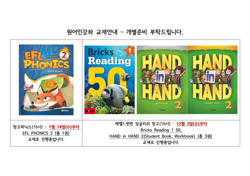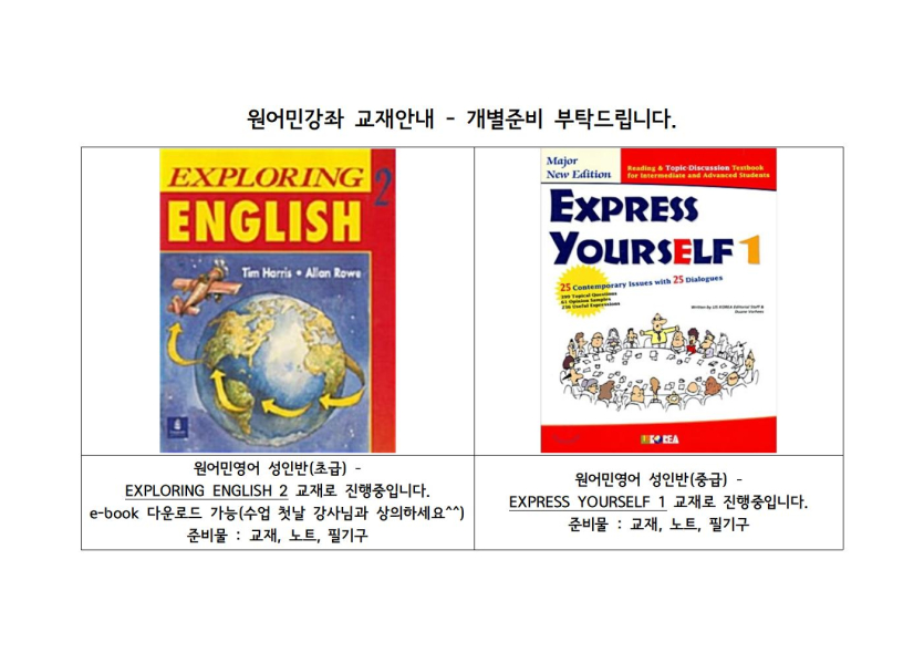 목록 [체육·문화] [교육문화]원어민강좌 교재안내(3월) 페이지 정보 작성자 시립망우청소년센터 댓글 0건 조회 27회 작성일 2026-03-03 본문 . 추천0 이전글2026년 망고 포즈 공모전 결과 발표 26.03.04 다음글[교육문화]봄학기(3월~5월) 폐강강좌 안내 26.02.28 댓글 0 댓글목록 등록된 댓글이 없습니다. 목록