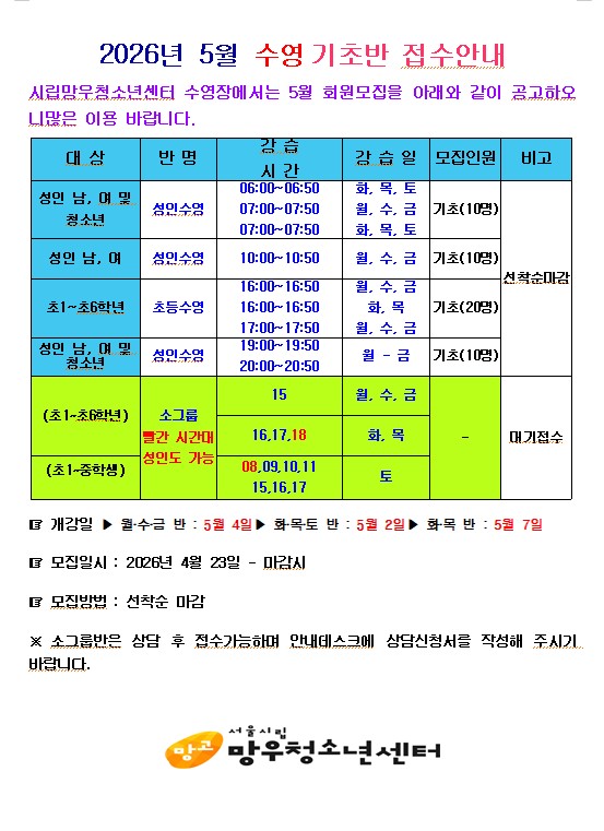 목록 [체육·문화] 2026년 5월 수영 기초반 접수안내 페이지 정보 작성자 시립망우청소년센터 댓글 0건 조회 116회 작성일 2026-04-20 본문 감사합니다. 추천0 이전글시립망우청소년센터 5월 휴관 안내 26.04.23 다음글[채용] 서울시립망우청소년센터 생활체육팀(토요일 오후 )수영강사 채용 공고 26.04.09 댓글 0 댓글목록 등록된 댓글이 없습니다. 목록