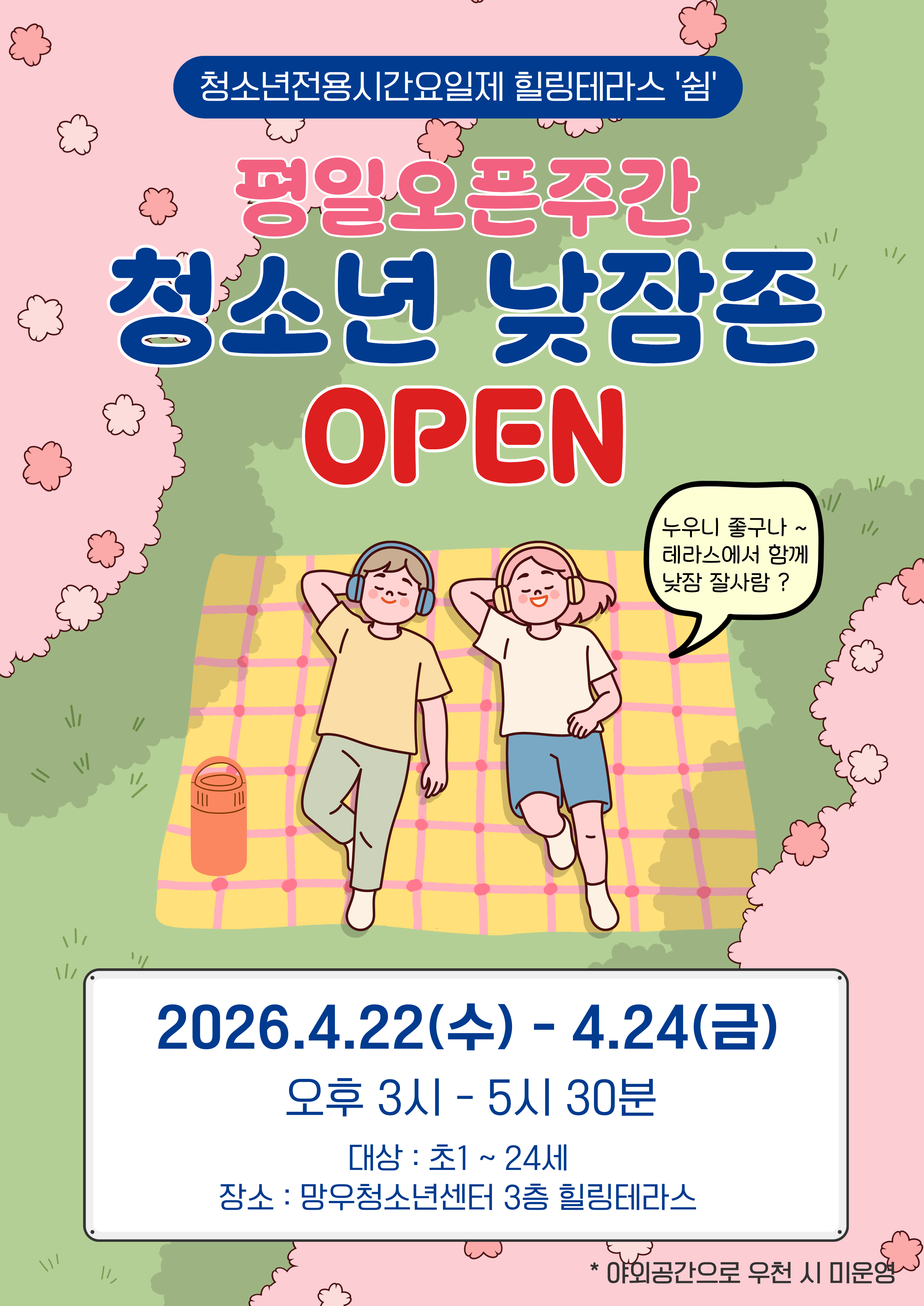 망우청소년센터에서 다양한 프로그램 안내 및 신청정보입니다.- 채용[채용] 서울시립망우청소년센터 생활체육팀(토요일 오후 )수영강사 채용 공고26.04.09