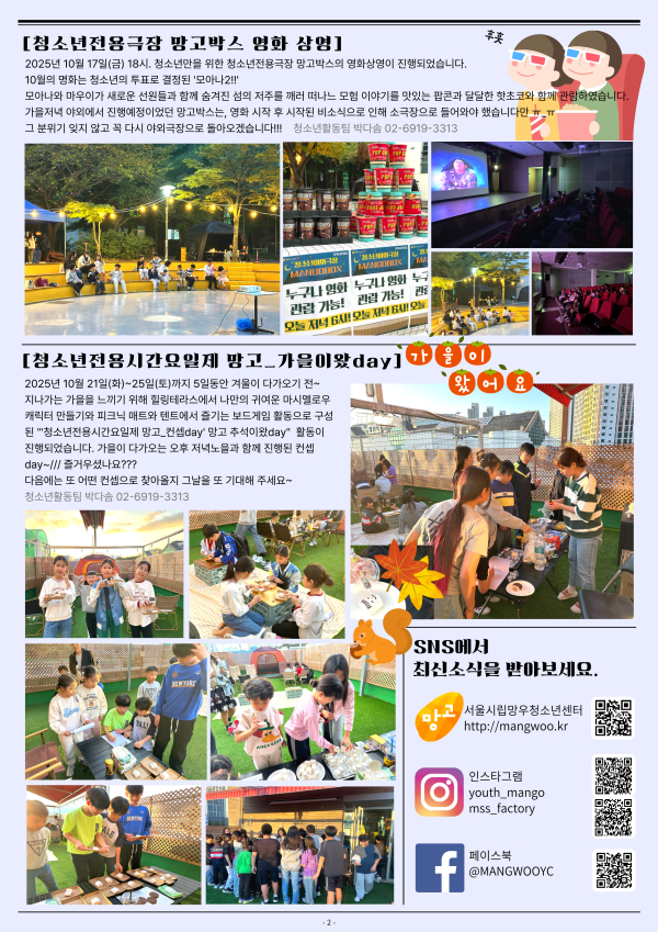 목록 2025년 '이달의 망고' 11월호 발간 페이지 정보 작성자 mangwoo 댓글 0건 조회 210회 작성일 25-11-05 17:56 본문 . 이전글2025년 '이달의 망고' 12월호 발간 25.12.17 다음글2025 겨울학기(12월~2월) 프로그램지(PDF참고) 25.11.04 댓글 0 댓글목록 등록된 댓글이 없습니다. 목록